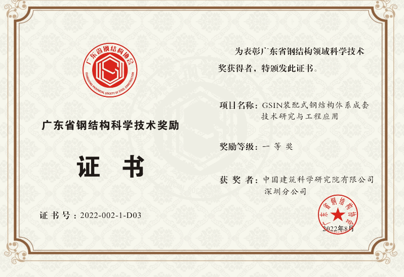 GSIN 裝配式鋼結(jié)構(gòu)建筑成套技術(shù)的應用是建造方式的重大變革,是推進新型建筑工業(yè)化發(fā)展的重要舉措,有利于節(jié)約資源能源、減少施工污染,有利于促進建筑業(yè)與信息化、工業(yè)化深度融合,是推進建筑業(yè)綠色發(fā)展、提高建筑質(zhì)量和安全性的重大舉措。項目科研成果獲2022年度廣東省鋼結(jié)構(gòu)協(xié)會科技進步一等獎。