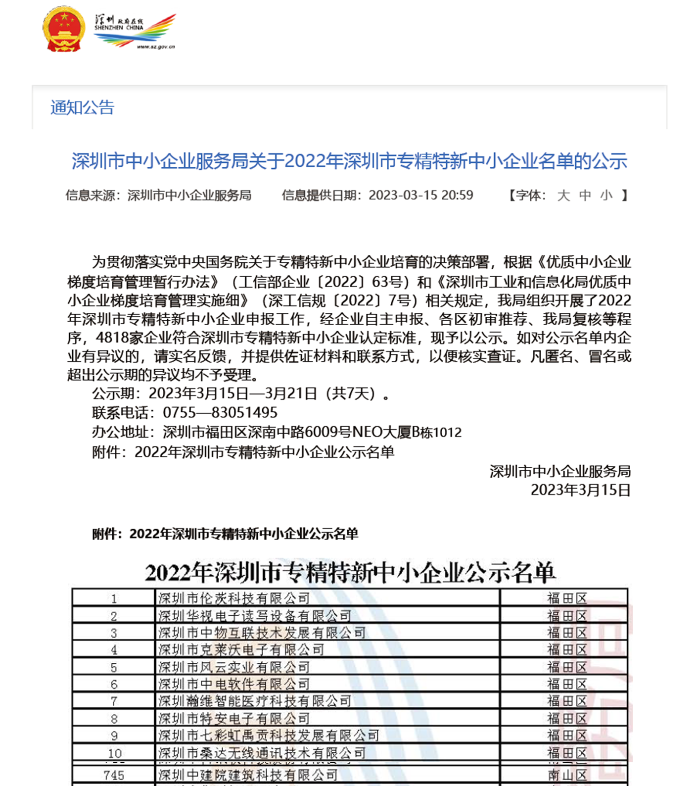 3月15日-21日,深圳市中小企業(yè)服務(wù)局對2022年深圳市專精特新中小企業(yè)名單進行公示,深圳中建院建筑科技有限公司(簡稱“深圳中建院”)獲得深圳市專精特新中小企業(yè)認定。