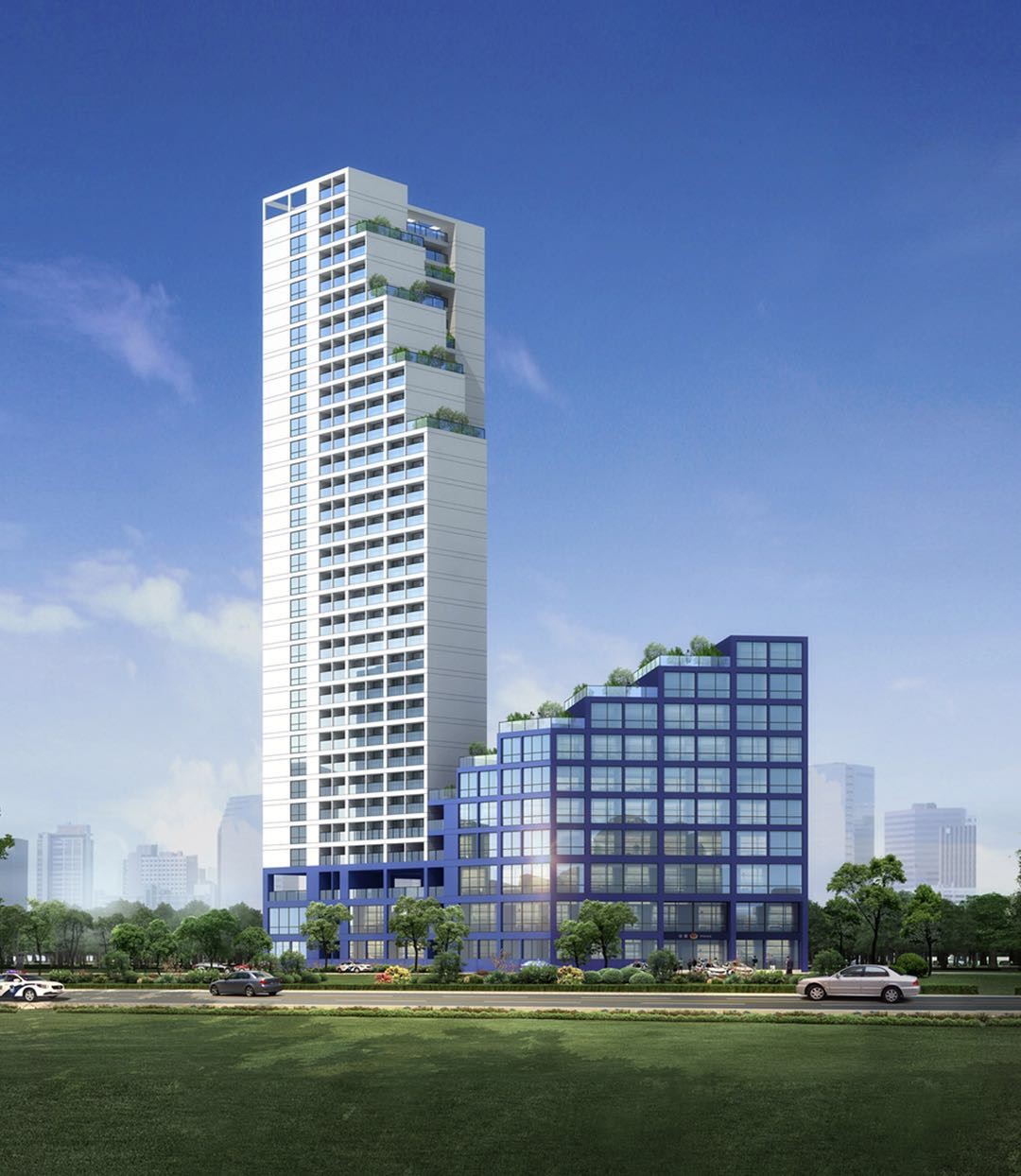 在建筑外觀設(shè)計(jì)上,方案以公安部門常用的“藍(lán)”與“白”作為主色調(diào),奠定簡潔務(wù)實(shí)的建筑外觀基調(diào),同時也將公安業(yè)務(wù)用房與生活配套用房以主色調(diào)區(qū)分開來。在造型上通過簡潔大方的建筑形式和退臺設(shè)計(jì),避免了刻板疏遠(yuǎn)的建筑形象,突出基層派出所親民、便民的工作風(fēng)格。契合了優(yōu)秀的建筑設(shè)計(jì)不僅追求使用的實(shí)用性,更應(yīng)追求適宜的建筑美感長久地服務(wù)于建筑功能的設(shè)計(jì)理念。