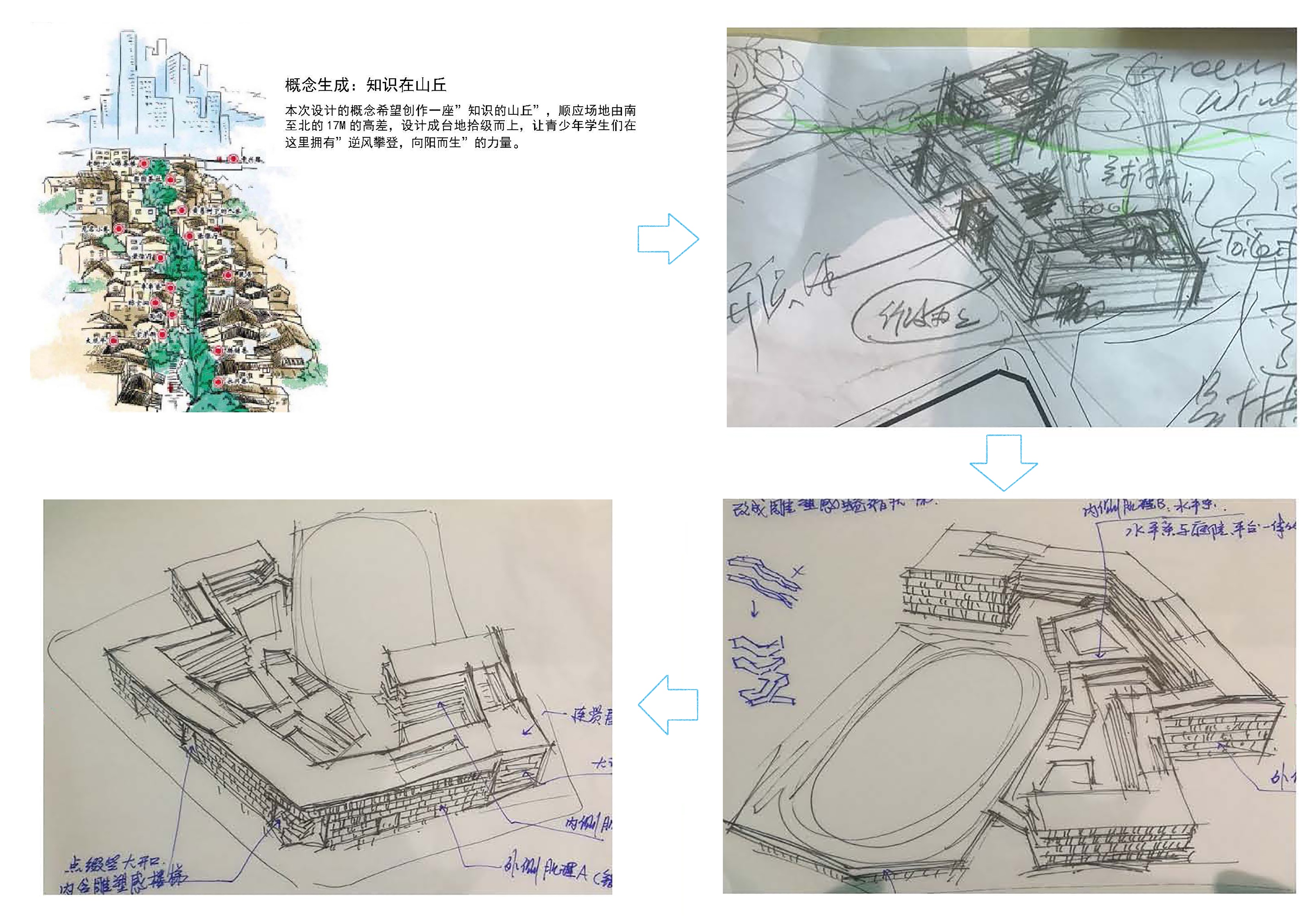 “書山有路勤為徑,學(xué)海無涯苦作舟”,求學(xué)之路道阻且難,每一位學(xué)子都須要傾其十余年心血,方能在學(xué)業(yè)上有所小成。我司深圳龍勝學(xué)校建筑方案以“知識的山丘”設(shè)計(jì)概念,將求學(xué)的攀登之路與項(xiàng)目的地形地貌相結(jié)合,為學(xué)校創(chuàng)作了一個寓理于景的立體式校園設(shè)計(jì)方案,以期展現(xiàn)莘莘學(xué)子勤勉求學(xué)的畫卷。