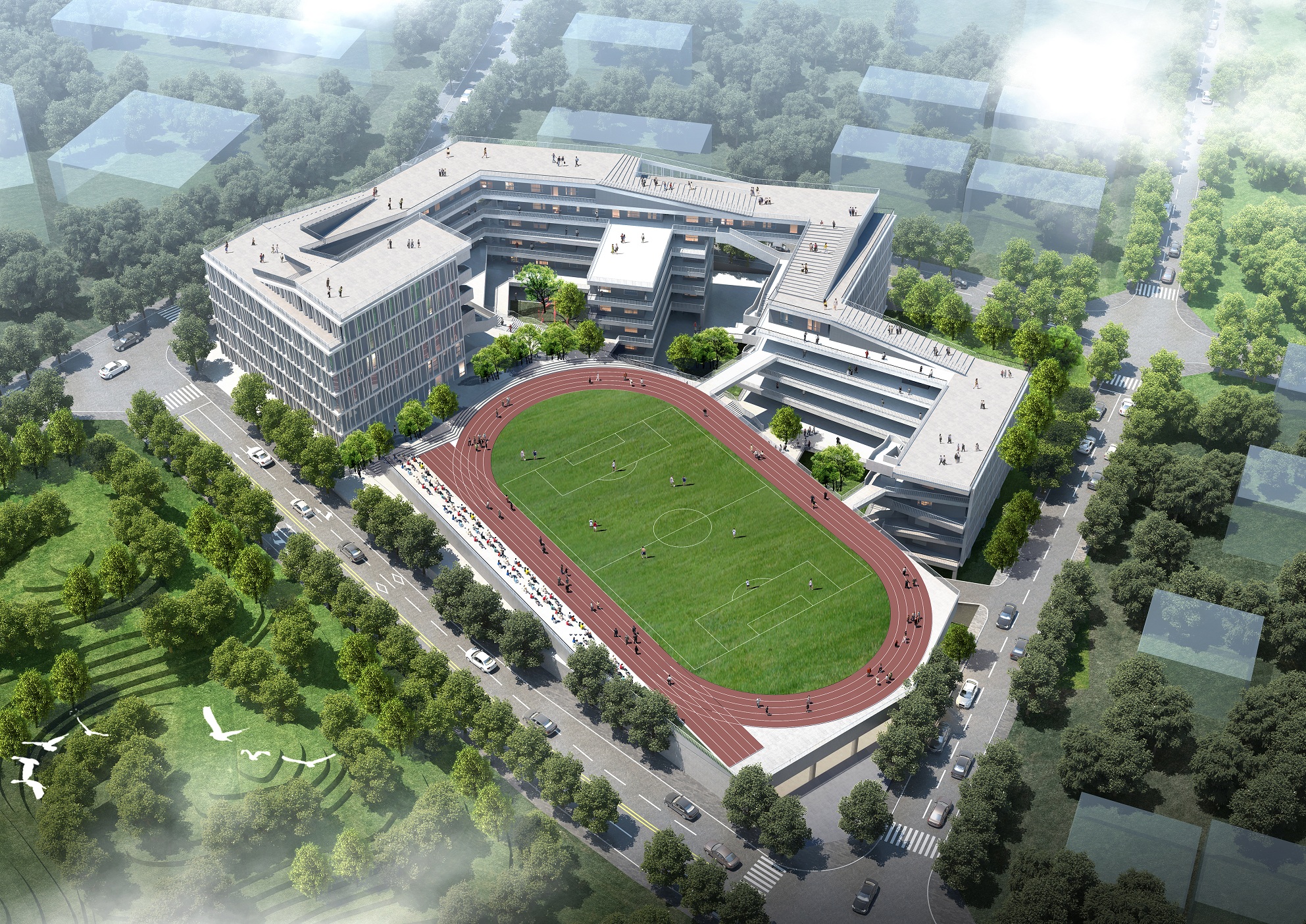 因地制宜的同時,方案也將先進(jìn)的設(shè)計(jì)理念與校園建筑相融合。通過對教育發(fā)展變化的理解和預(yù)測,力求打造一個能長期服務(wù)于基礎(chǔ)教育的教學(xué)空間,對校園建筑設(shè)計(jì)的現(xiàn)代化、網(wǎng)絡(luò)化、綠色生態(tài)發(fā)展方面進(jìn)行了深刻解讀。設(shè)計(jì)中盡可能地考慮到長遠(yuǎn)的教學(xué)技術(shù)利用與更新,日常信息的交換與流通以及優(yōu)美舒適的園林化校園環(huán)境的搭建,以期達(dá)到設(shè)計(jì)的前瞻性和校園建筑與周邊環(huán)境和諧共生的目標(biāo)。