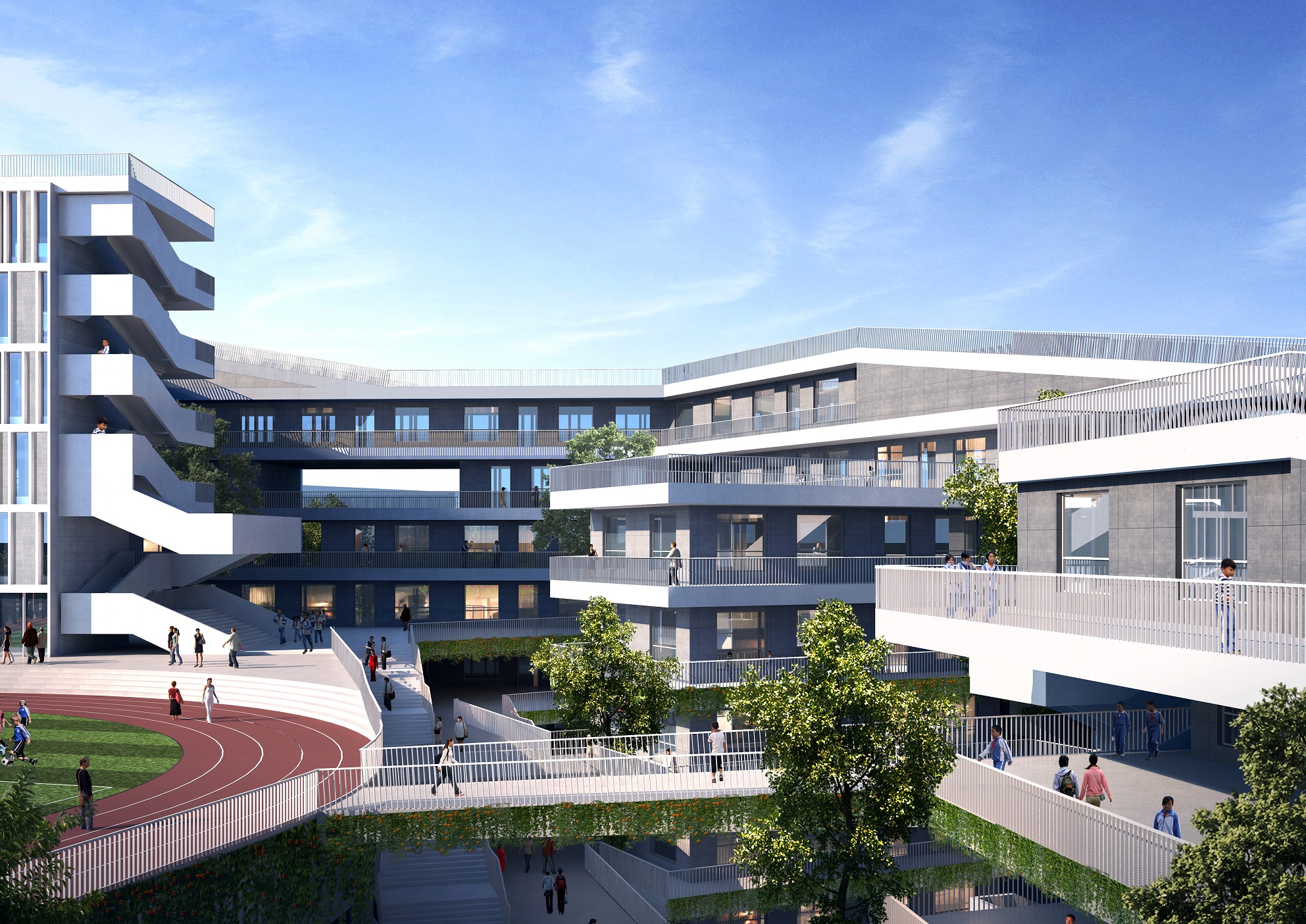 位于不同臺地上的多層教學(xué)樓的建筑群體中,在體量交接的端部形成搭接,使建筑群具有連續(xù)性的生動輪廓,四棟樓形體上各有變化,建筑頂部設(shè)有堆疊的小體量休閑建筑,使建筑屋頂天際線輪廓豐富,并形成適合師生休憩活動的場所。