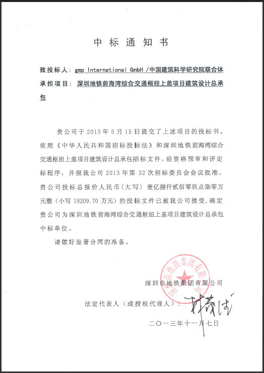 近日,我院與德國GMP國際建筑設(shè)計公司組成的設(shè)計聯(lián)合體收到了深圳市地鐵集團有限公司發(fā)來的關(guān)于深圳地鐵前海灣綜合交通樞紐上蓋項目建筑設(shè)計總承包的中標通知書。