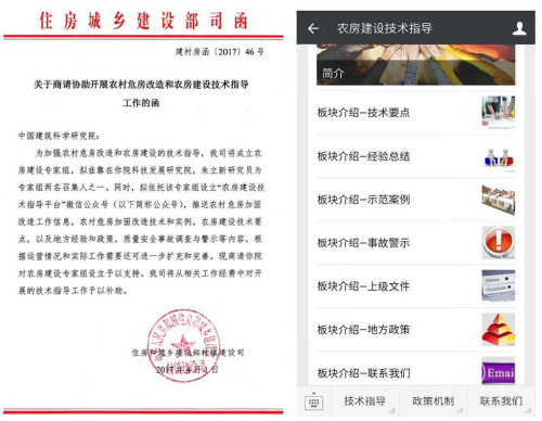 為配合專家組工作的開展,受住房和城鄉(xiāng)建設部村鎮(zhèn)建設司委托,依托專家組設立“農房建設技術指導”微信公眾號,致力于農房建設知識普及化、技術指導精準化,搭建上下互通,技術指導與示范建設協調并進的平臺。微信公眾號由住房和城鄉(xiāng)建設部村鎮(zhèn)建設司主導,我院科技發(fā)展研究院負責日常運營和管理,各地方村鎮(zhèn)建設管理部門和技術指導專家定期或不定期上傳相關信息,配合和支持公眾號的運營。